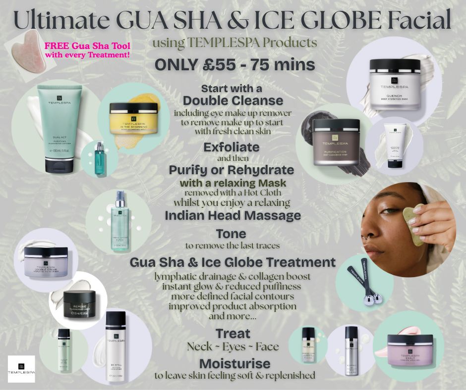 PLUS: with the Ultimate GUA SHA & ICE GLOBE Facial you’ll receive a FREE Gua Sha tool, sponge and spatula so you can carry on creating and receiving the benefits at home! This treatment also includes a mask AND an Indian Head Massage!